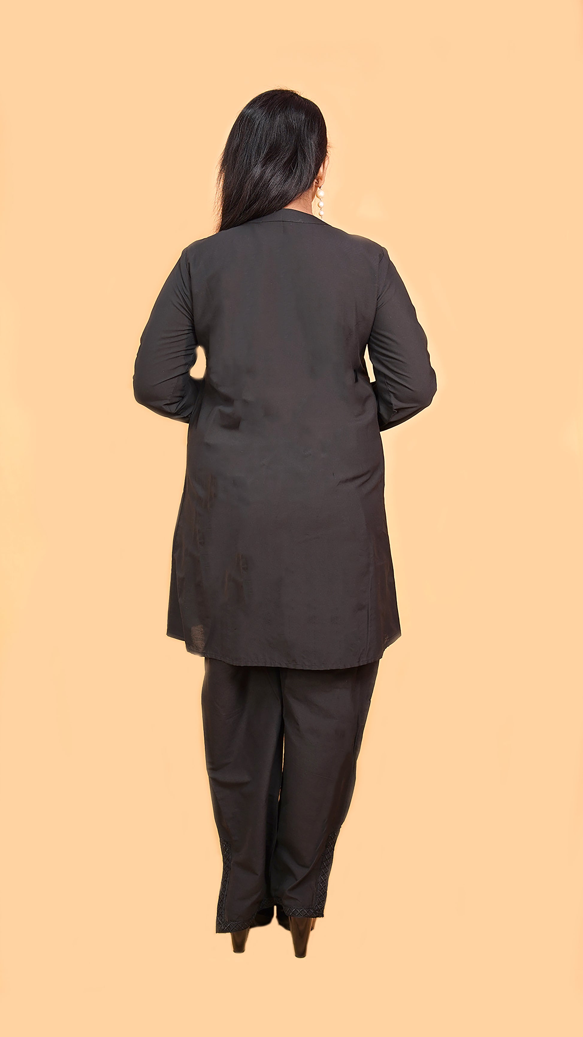 Upgrade your wardrobe with this elegant black co-ord set, crafted in luxurious cotton silk fabric for a perfect balance of comfort and sheen. Designed with lace accents and minimalist detailing, this ensemble offers understated sophistication with a modern appeal. Ideal for parties, festive occasions, office gatherings, and evening outings, this co-ord set delivers effortless style and versatility.