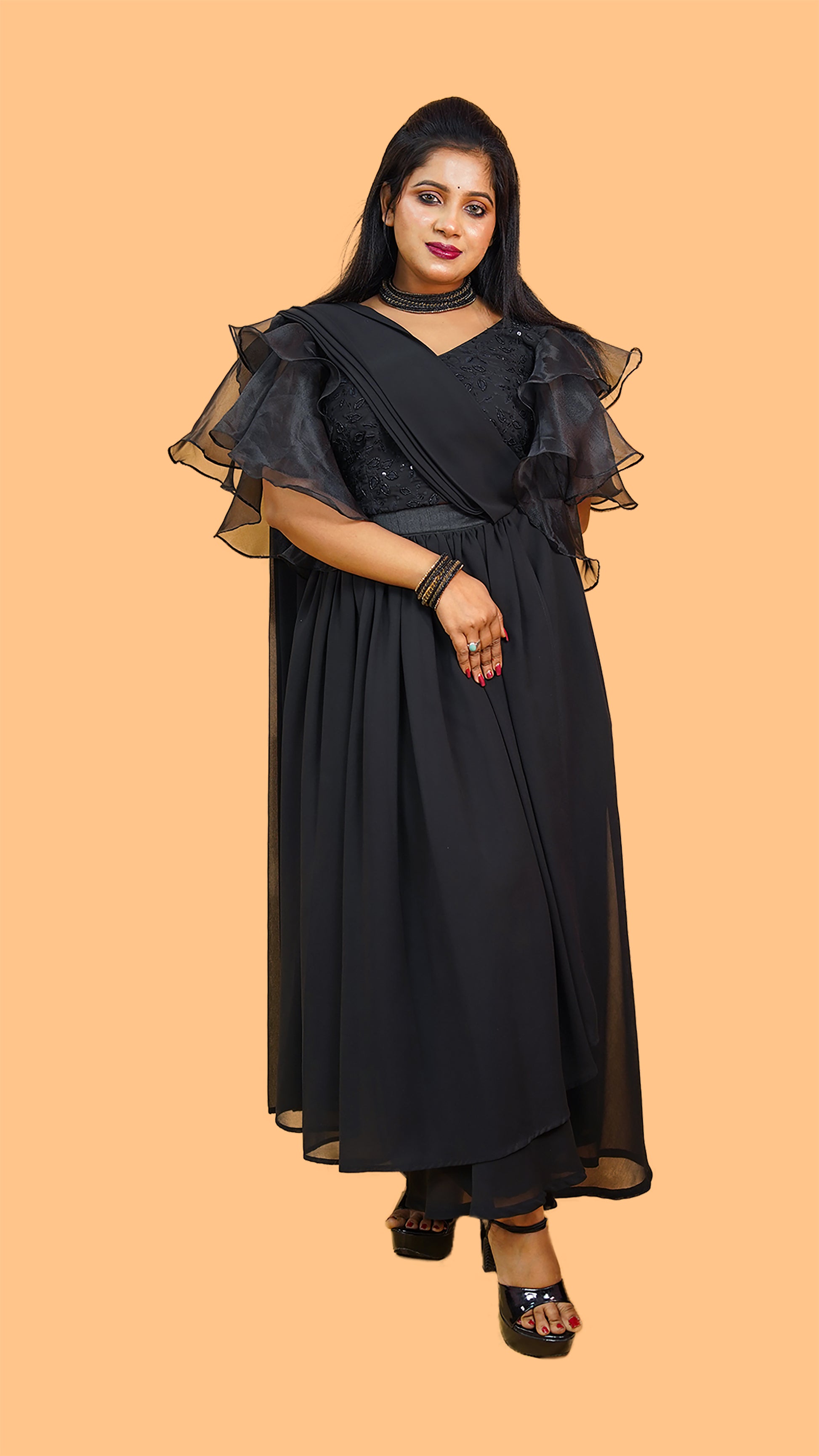 Step into contemporary elegance with this stylish drape skirt with pant and blouse set, designed for modern festive and party wear. The ensemble features a beautifully embellished blouse with layered sleeves, adding texture and a touch of glamour. Paired with a chic drape skirt layered over a pant, this outfit offers a perfect balance of comfort, sophistication, and statement style—ideal for weddings, festive celebrations, and evening occasions.