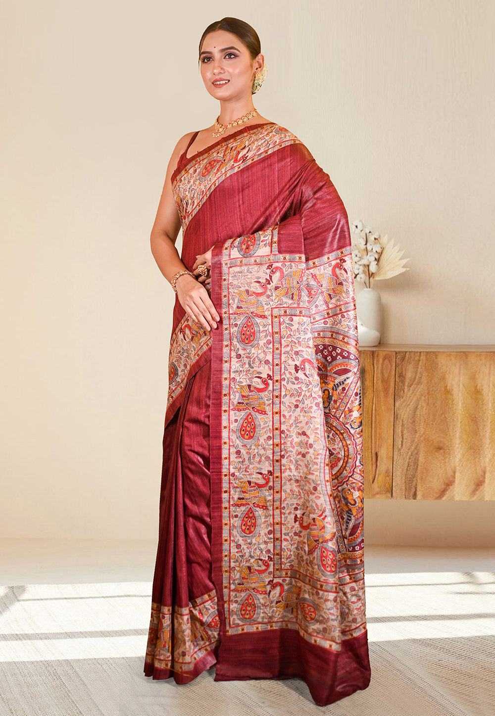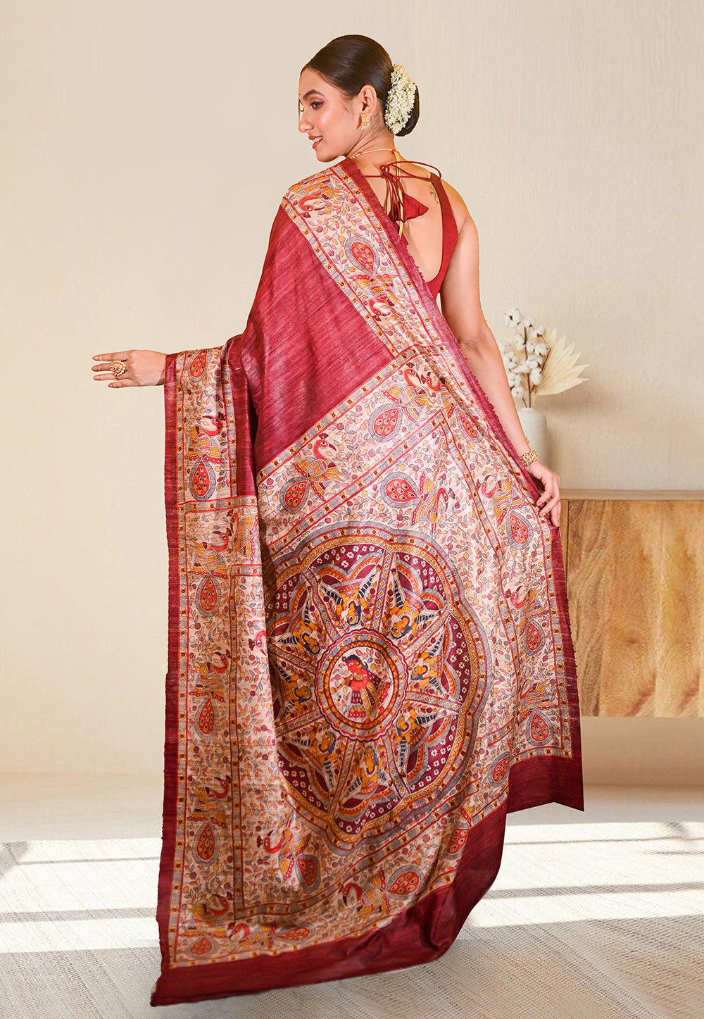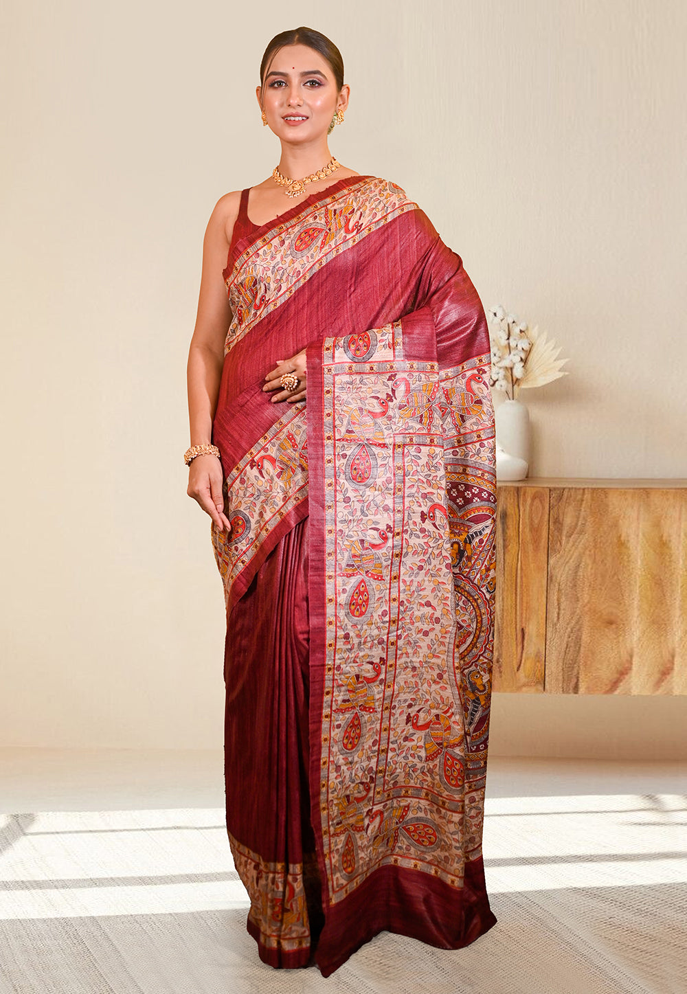 PURE BISHNUPURI GHICHA TUSSAR SILK IN MAROON COLOR INTRICATE MADHUBANI HAND PAINTED DESIGN